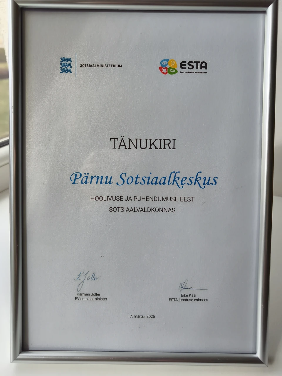 Pärnu Sotsiaalkeskus sai tunnustatud ESTA poolt kategoorias "Klient kiidab".